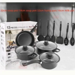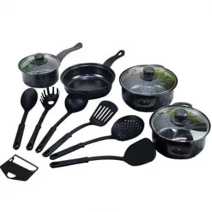 - Complete set: Deze kookgereicollectie bestaat uit een uitgebreide set van 13 stuks, waaronder soeppannen, koekenpannen, glazen deksels en een set nylon kooklepels. Hiermee heeft u alles wat u nodig hebt voor diverse kooktaken en culinaire avonturen.