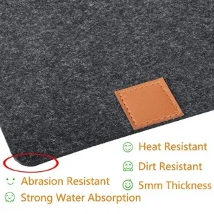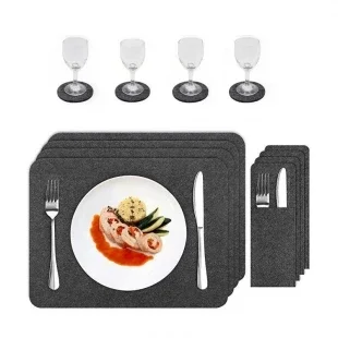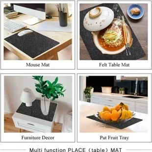 - Materiaal van topkwaliteit: Dit kenmerk benadrukt dat de placemats en onderzetters zijn gemaakt van hoogwaardig vilt, bekend om zijn duurzaamheid en veerkracht. De dikte van 5 mm zorgt voor een stevige constructie die bestand is tegen dagelijks gebruik zonder gemakkelijk te verslijten en langdurige bescherming biedt tegen vlekken en krassen.