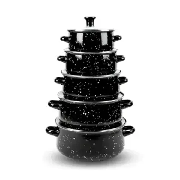 Heavy-Duty Emailverf: Het gebruik van heavy-duty emailverf zorgt ervoor dat de potten hun onberispelijke uiterlijk behouden, zelfs bij veelvuldig gebruik. Deze eigenschap spreekt over de duurzaamheid en levensduur van de set, en belooft jarenlange betrouwbare prestaties in de keuken.